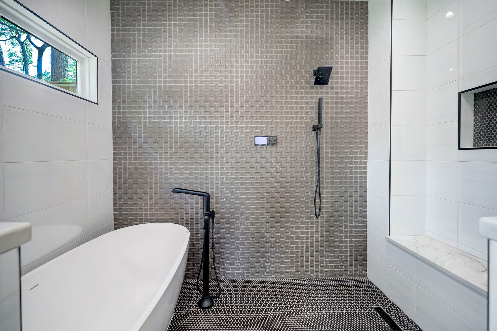 Notable features include floor-to-ceiling windows that invite natural light, outstanding high ceilings that amplify the sense of space. The materials used in this transformation include a tasteful mix of metal finishes, quartzite and quartz countertops, porcelain, vinyl wood flooring, glass tile, and marble tile.
